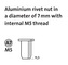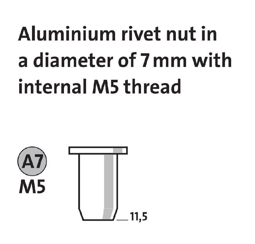 Nitowana nakrętka wykonana z aluminium, o zewnętrznej średnicy 7 mm i gwincie wewnętrznym M5, doskonale nadaje się do stosowania w materiałach nieżelaznych i lekkich. Długość standardowa to około 11,5 mm co odpowiada zakresowi grubości materiału 1 - 2 mm.