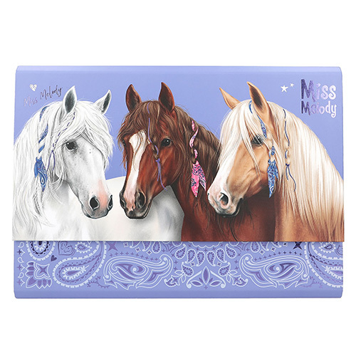 Dětská dopisní sada pro dívky s tvrdými deskami Miss Melody s metalickými vzory. Sada obsahuje 18 obálek ve třech barvách o velikosti C6 a 24 dopisních papíru ve třech barvách s potiskem motivu koní a jemným linkováním. Zavírání je na suchý zip.