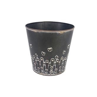 Květináč plechový. Rozměry : průměr 18 cm, výška 17 cm. Barva : hnědá, místy rezavá. Materiál : kov. číst celé