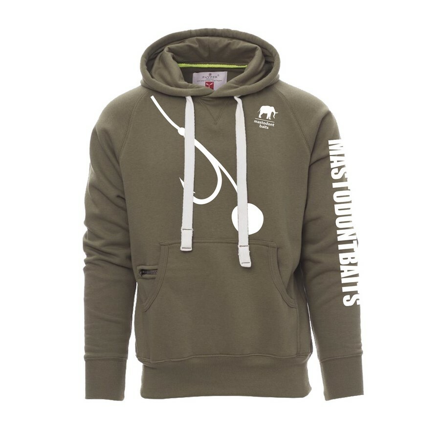 Pánská mikina olivové barvy pro rybáře v designu mastodont baits. Mikina s kapucí s dvojitým prošitím, bílá stahovací šňůrka se sladěným prošitím a s kovovými kroužky, raglánové rukávy, V-prošívání pod krkem, klokaní kapsa, kapsička na zip, manžety a pas s elastickým žebrováním, zesílené švy.