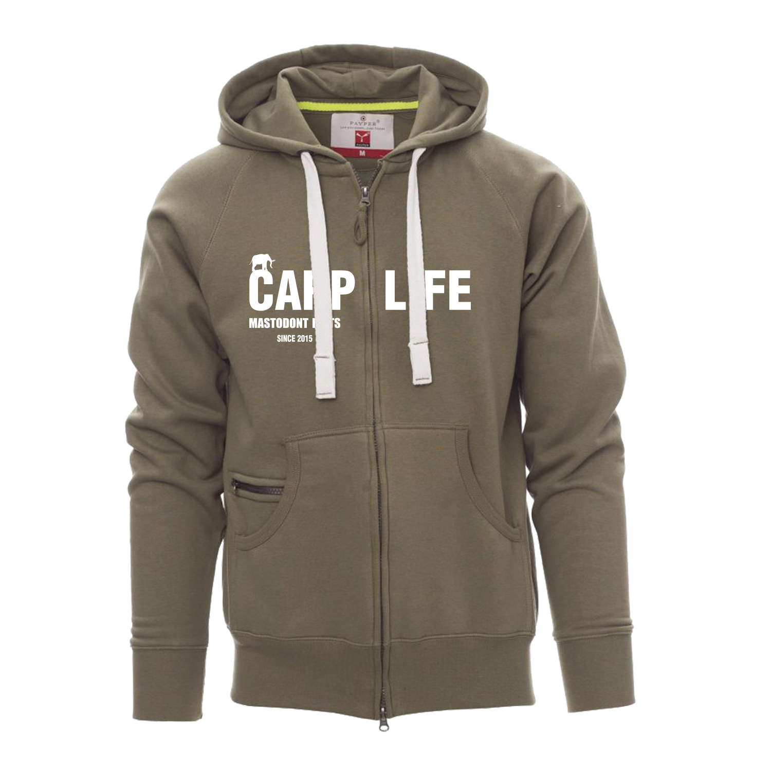 Pánská mikina Carp Life v olivové barvě pro rybáře v designu mastodont baits. Mikina s kapucí s dvojitým prošitím, bílá stahovací šňůrka se sladěným prošitím a s kovovými kroužky, raglánové rukávy, V-prošívání pod krkem, klokaní kapsa, kapsička na zip, manžety a pas s elastickým žebrováním, zesílené švy.