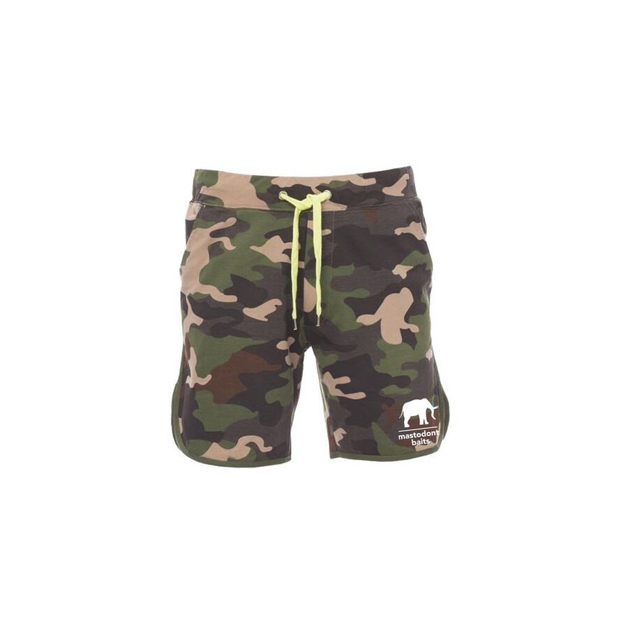 Pánské teplákové bermudy v camou barvách s elastickým pasem a stahovací šňůrkou, poklopec na zip, dvě přední kapsy a kontrastní lem.