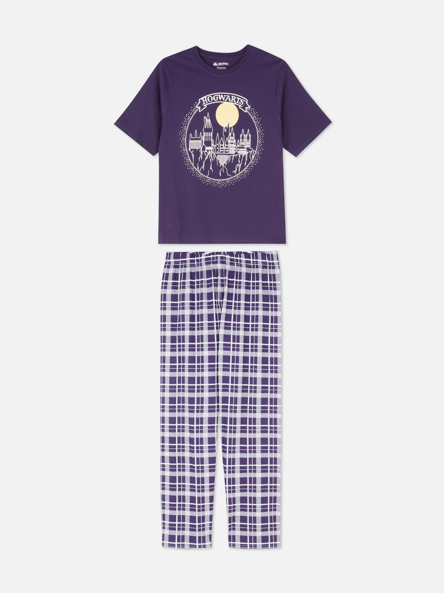 Dámské pyžamo s krátkým rukávem a dlouhými károvanými volnějšími kalhotami.