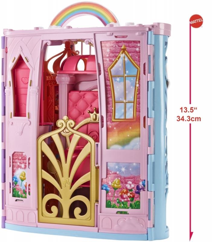Přidej se k Barbie® Duhové princezně a štěňátku Honey, kteří vládnou svému království z Duhového zámku! Zámek má spoustu fantastických vychytávek a doplňků. Jakmile je čas si odpočinout, trůn princezny Barbie® můžeš přeměnit na pohodlnou postel. Dokonce i štěňátko Honey má svou malou postýlku. Je čas vstávat! Co si užít trochu zábavy? Pomoz štěňátku do výtahu ve tvaru mráčku, který ho vyveze do druhého patra, odkud se může sklouznout na své hřiště. Jakmile je čas na magickou oslavu, pomoz oběma se upravit. Zvedni skříňku a odhal panenčin kosmetický stolek s parfémem a šperky. Vládnutí magickému království nikdy nebyla taková zábava! Set je zcela přenosný a můžeš si ho vzít všude s sebou.