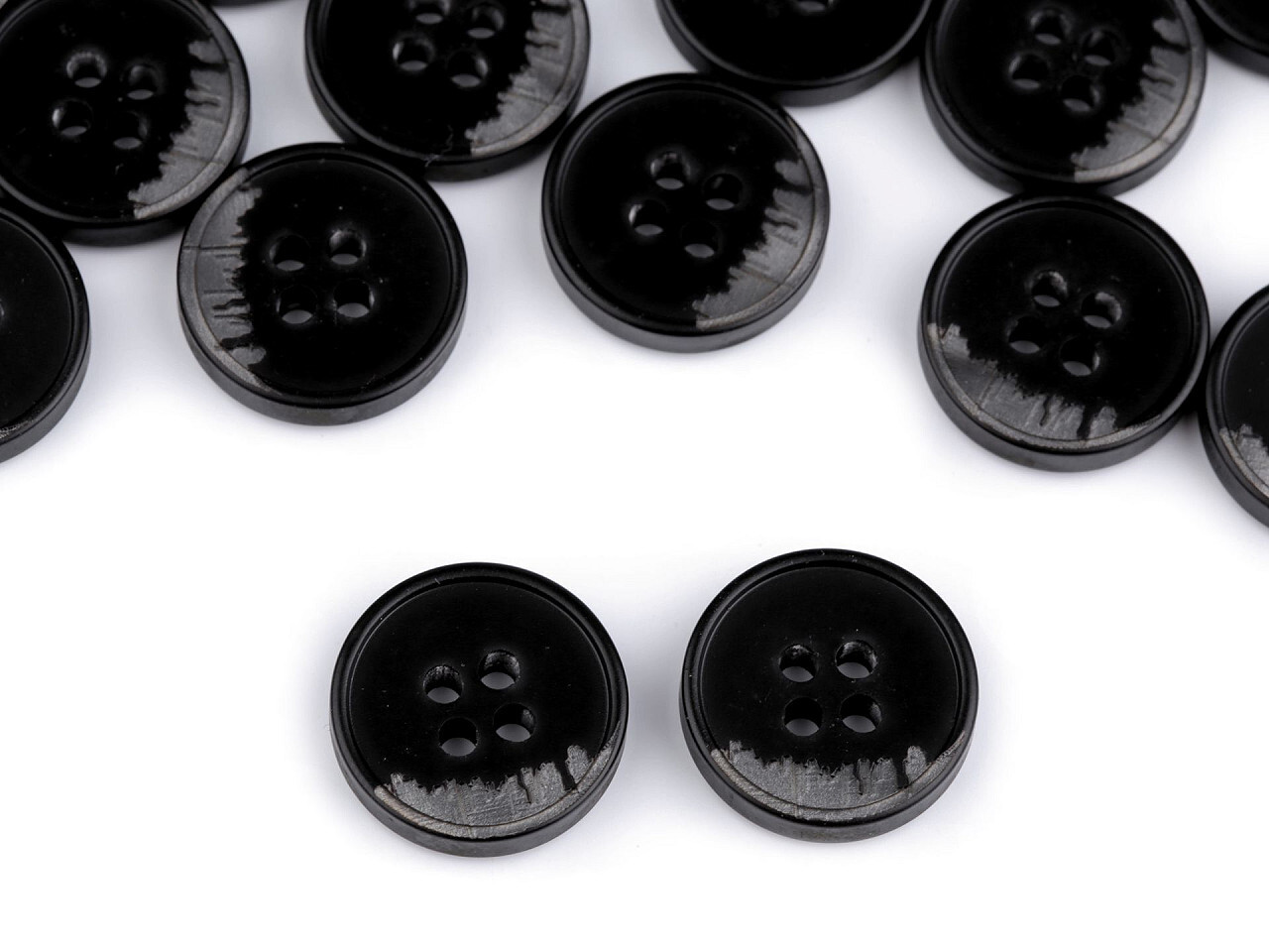 Efektní čtyřdírkové knoflíky vyniknou na košilích, sakách, bundách i svetrech. Část knoflíku je designově šrafovaná.