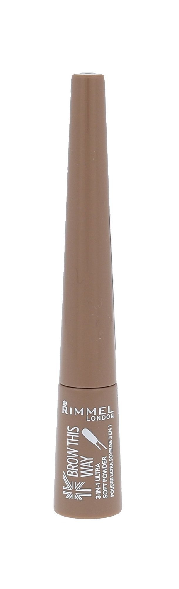 Jemný pudr na obočí **Rimmel London Brow This Way 3in1 Ultra Soft Powder**. Pudr Rimmel London Brow This Way 3in1 Ultra Soft Powder definuje a vyplňuje obočí. Snadno se nanáší a obočí dodá krásnou barvu a tvar. **Poznámka**: *Vyobrazený odstín může být spíše orientační, záleží na nastavení barev...