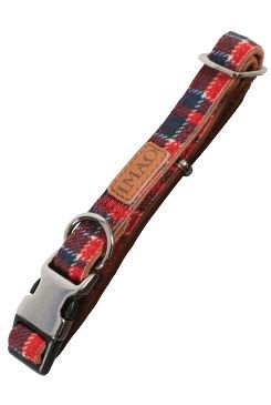 Nastavitelný obojek se skotským vzorem a kovovou sponou s vyrytým logem "Zolux". Všechna vodítka, obojky a postroje z této řady jsou opatřena koženou nášivkou "Imao".
