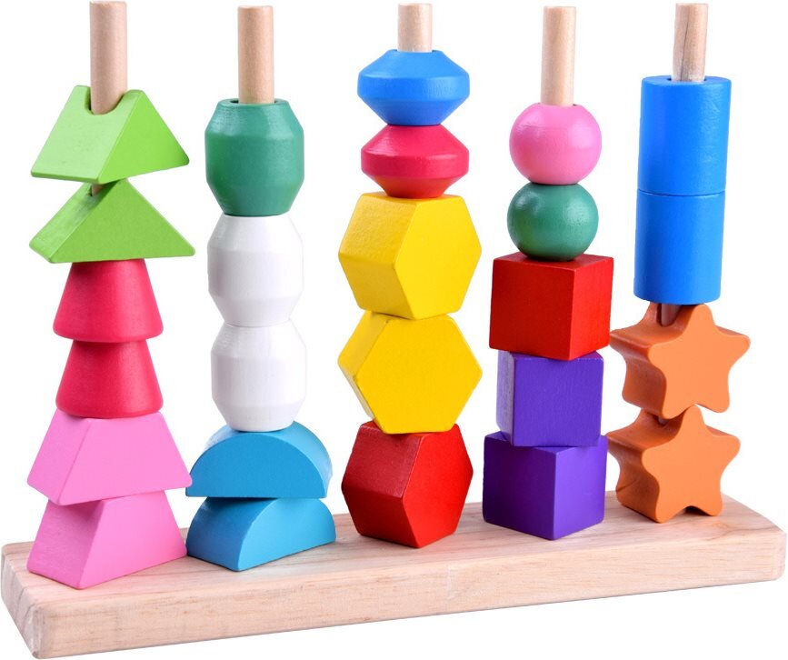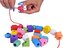 dítě si může hrát dvěma způsoby - nasazováním kostek na kolíky podle přiložených karet nebo navlékáním na provázek,
