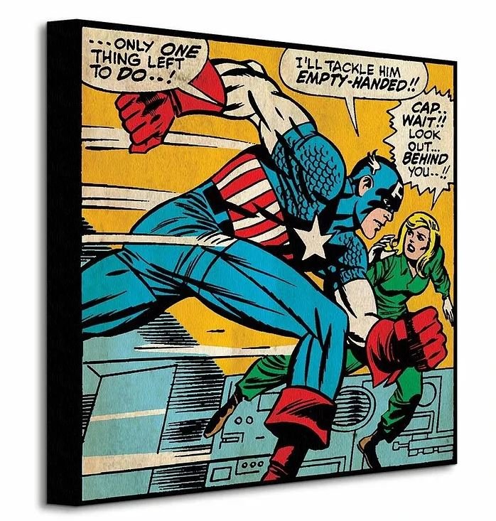 Obraz na plátně s výjevem z komiksu Captain America bude hezký dárek a doplněk domácnosti pro fanoušky tohoto komiksového superhrdiny od Marvel Comics. Kvalitní bavlněné pláno je napnuto na dřevěném rámu.