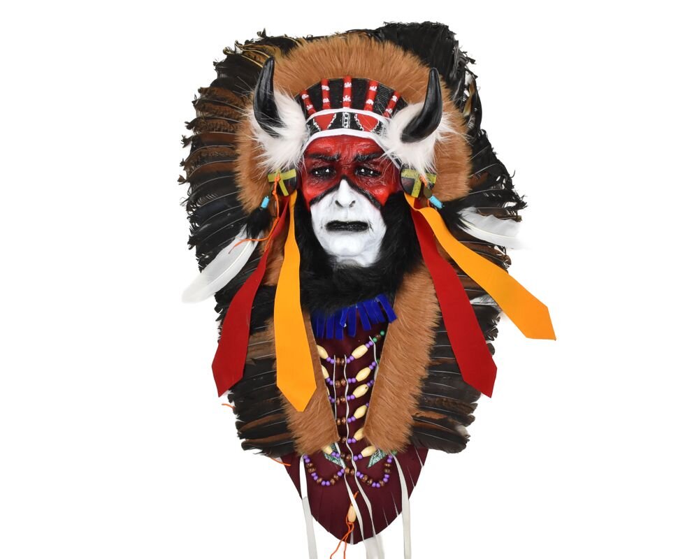 Indiánští náčelníci byli vůdci a moudří rádci svých kmenů, kteří nesli odpovědnost za rozhodování, ochranu a blaho komunity. Jejich autorita vycházela z osobní ctnosti, zkušeností a schopnosti vést, spíše než z dědičného práva. Často byli vnímáni jako strážci tradic, duchovní vůdci a zprostředkovatelé mezi lidmi a přírodou. Náčelníci byli respektováni pro svou statečnost, spravedlnost a schopnost vyjednávat s ostatními kmeny nebo kolonizátory, a jejich role byla klíčová pro udržení harmonie a rovnováhy v kmeni.S dekorací je dodáván háček pro zavěšení na zeď.