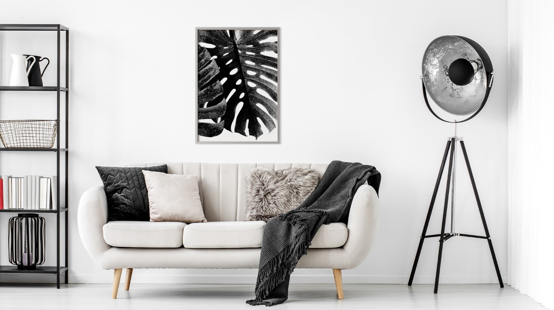 Obraz v rámu Černobílý Tropický List různé rozměry hliníkový rám stříbrná