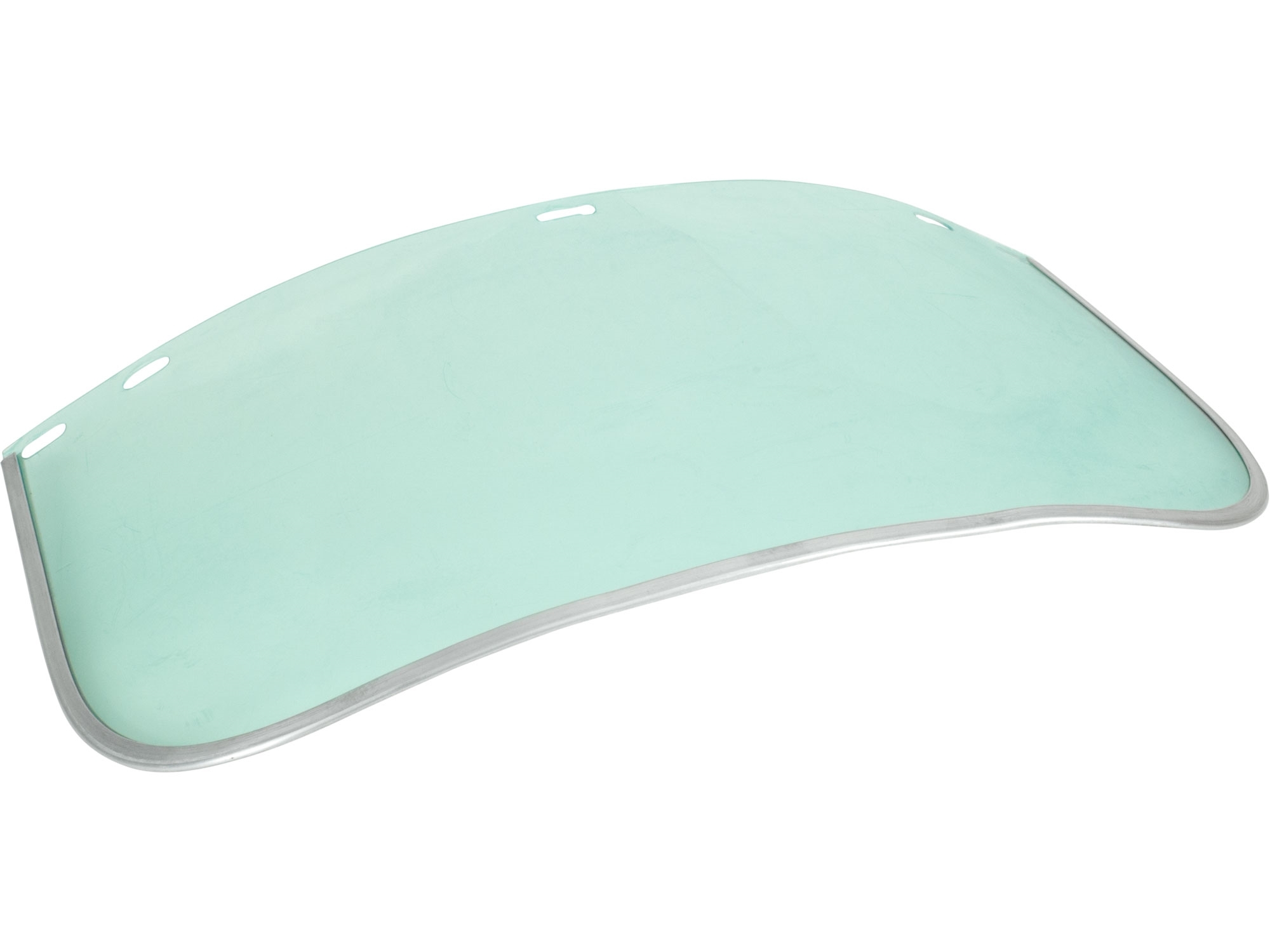 polykarbonátový štít je z obou stran opatřen ochrannou folií a dále kovovou obrubou s tvarovou pamětí a lze jej tak ve směru šířky v případě potřeby lehce dotvarovat číst celé
