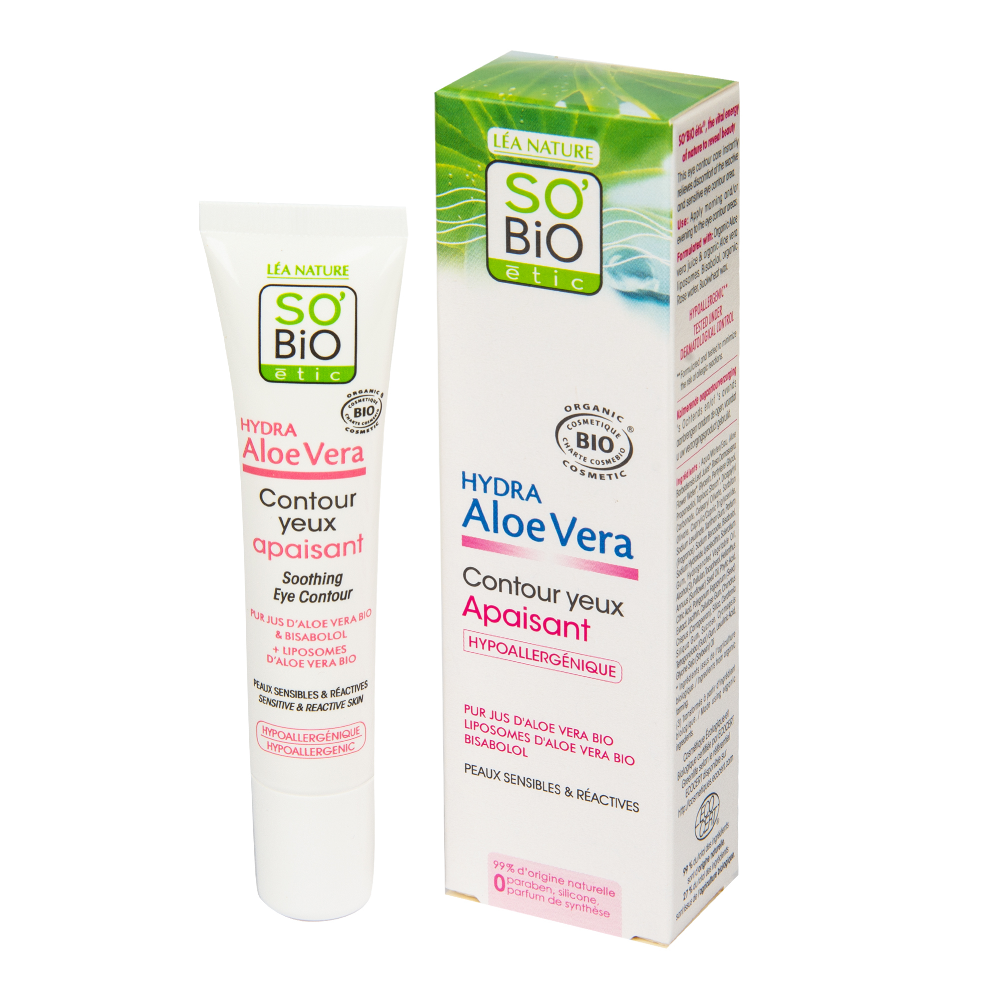 Zklidňující krém kolem očí HYDRA Aloe Vera od SO´BiO étic je výborný především pro citlivé oči a přecitlivělou a reaktivní pokožku očního okolí. Pokožku hydratuje a zmírňuje otoky pod očima. Má okamžitý zklidňující a chladivý efekt zejména díky vysokému obsahu organické šťávy z aloe vera. Dále obsažená růžová voda křehkou pleť zklidňuje a působí také regeneračně. Krém je navíc obohacen o zklidňující bisabolol a lipozomy.