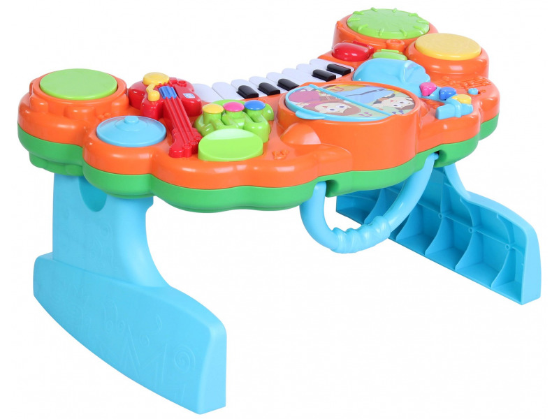 Hudební pult nabízí zvuky deseti různých hudebních nástrojů. Velká tlačítka usnadňují batolatům ovládání pultu. Při otáčení stránek obrázkové knížky, která je součástí pultu, hrají různé melodie. Pult je možné používat nasazený na podstavných nohách i samostatně např. na stole či na hrací dece. Držadlo usnadňuje přenášení.