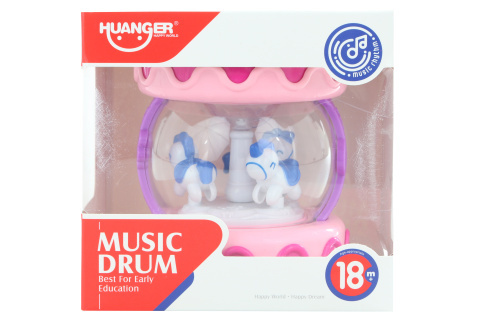 Růžový bubínek s mnoha funkcemi. Bubínek hraje melodie, vydává zvuky zvířátek, hraje jako bubínek. Když bubínek hraje, tak svítí a koníci uvnitř se točí. Součástí je také ovládání hlasitosti. Rozměry bubínku cca 10 x 10 x 11 cm. Rozměry balení cca 14 x 13,5 x 11 cm. Věk 18m+