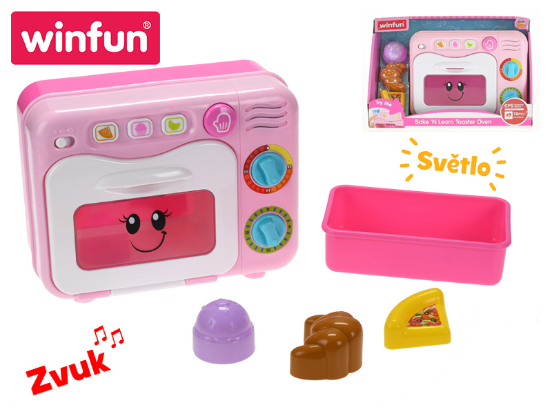 Pro malé hospodyňky a kuchařky je tento set jako stvořený. Didaktická hračka z kolekce Winfun se skládá z růžové trouby, formy na pečení a třech formiček, které nabízí mnoho zábavy. Formičky přestavují potraviny - dílek pizzy, rohlík a muffin. Tato 20 cm vysoká trouba na baterie s několika ovládacími tlačítky či otočnými regulátory vydává zvuky a také svítí. Je vyrobena z plastu v pestrých barvách, přesně takových, které mají malé holčičky rády.