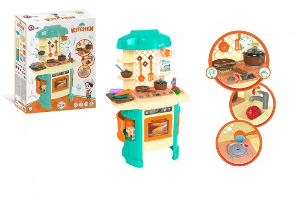 Kuchyňka, ve které se nejen holčičky budou cítít jako pravé kuchařky. Sada obsahuje veškeré potřebné vybavení na pečení a vaření, celkem 29 ks. Kuchyňka malé kuchtítky zaujme i zvukovými, světelnými efekty, ale také efekty páry. Baterie 3x AA nejsou součástí balení. Rozměr kuchyňky po sestavení 51 x 81 x 30 cm. Rozměry balení 48 x 62 x 20 cm. Vhodná pro děti od 3 let.