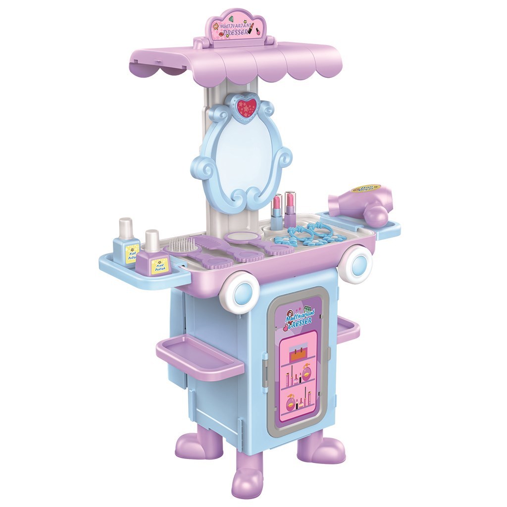 Dětský toaletní stoleček v praktickém kufříku ve tvaru autobusu je ta nejlepší hračka pro každou holčičku, která touží být krásnou princeznou. Sada obsahuje láhve s "parfémy", hřeben a kartáč na vlasy, rtěnky, prstýnky, ruční zrcátko a gumičku do vlasů. Určeno pro děti od 3 let. Baterie 3xAAA nejsou součástí balení.