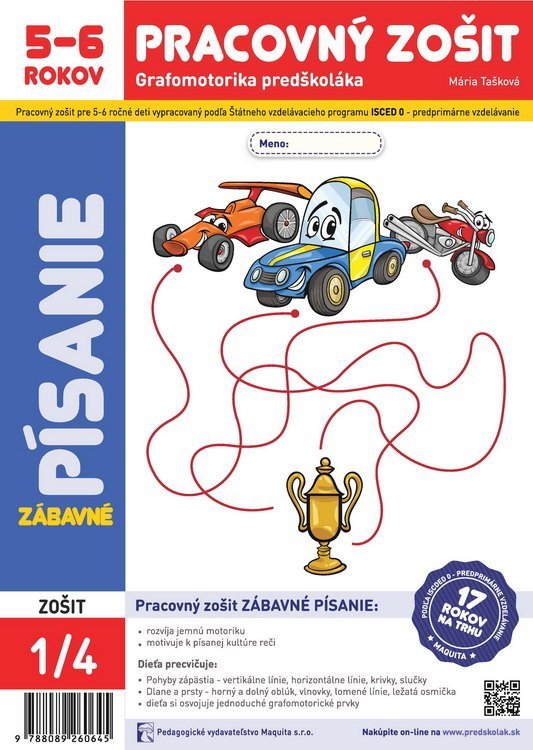 Úlohou je na jednotlivých pracovných listoch precvičovať základné prvky písania a ich spájanie. Dieťa prejde postupne od bodu k čiarke, kruhu, slučke. Dôležitým pracovným prvkom je vyfarbovanie pracovného listu, kde dieťa rozvíja hrubú a jemnú grafomotoriku a estetické vnímanie. Prípravné...