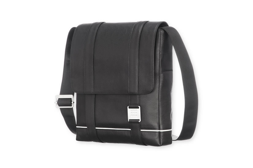 Taška je vyrobena z černé měkké kůže. Zavírá se pomocí klopy na magnety a má nastavitelný popruh přes rameno. Uvnitř jsou 2 velké kapsy, jedna z nich určena na tablety a notebooky do velikosti 11 a dále menší kapsa na zip a kroužek na klíče. Rozměry: 24 x 28 x 6 cm