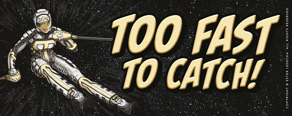 Samolepka na auto Too fast to catch vtipně upozorní na velké sportovce ve voze. číst celé