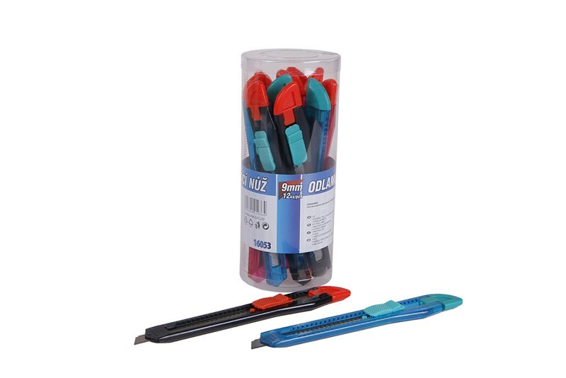 Sada plastových odlamovacích nožů 9mm, 12ksů, plastová kruhová dóza, barevný mix. číst celé