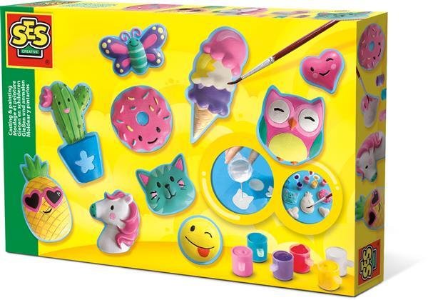 Tato sada SES Creative umožňuje vytvářet všechny barevné postavičky z rychle schnoucí sádry. Vyrobte si jednorožce, smajlíka, motýla a další.... Nalijte sádru do formy a nechte ji ztvrdnout. Poté vyjměte z formičky a můžete vybarvovat díky 6 pastelovým barvám. Výsledek je fantastický! Barvy a sádra se jednoduše praním odstraní z oděvů. Sada obsahuje: Rychleschnoucí sádru, formu, 6 trendových barev, štětec a uhlazovací pomůcku. Věk: 5+