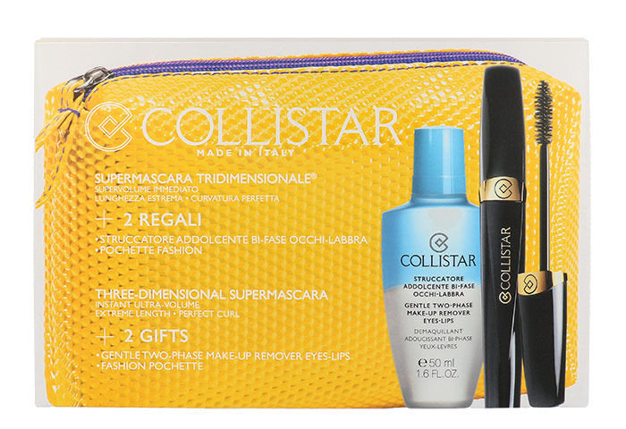 Dekorativní kazeta **Collistar 3D Supermascara Duo Kit**. **Složení kazety**: **3D Supermascara 8 ml Extra Black - Řasenka** Řasenka pro dokonalý objem a délku řas. **Gentle Two Phase Make-Up Remover 50 ml - Dvoufázový odličovač na oči a rty** Rychle odstraňuje všechny typy make-upu, včetně těch voděodolných. Zároveň pokožku hydratuje a díky výtažkům z měsíčku a slézu poskytuje očním víčkům pocit pohodlí. **Bag**