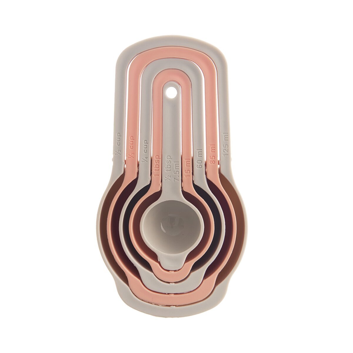 Sada 5 odměrek pro měření malých objemů je skvělým pomocníkem při pečení a vaření přesně podle receptů. Jednotlivé odměrky do sebe zapadají, což je velmi praktické pro ukládání, jsou spojeny řetízkem, ale dají se z něho velmi snadno sundat a jednotlivě použít. Materiál: plast PP. Rozměry: 7,5 ml/1/2 tbsp (lžíce), d. 9,8 cm, š. 3,2 cm, 15 ml/1 tbsp, d. 11 cm, š. 4,4 cm, 60 ml/1/4 cup (hrnku), d. 12 cm, š. 5,5 cm, 85 ml/1/3 cup, d. 13,3 cm, š. 6,7 cm, 125 ml/1/2 cup, d. 14,5 cm, š. 8 cm. Lze mýt v myčce.