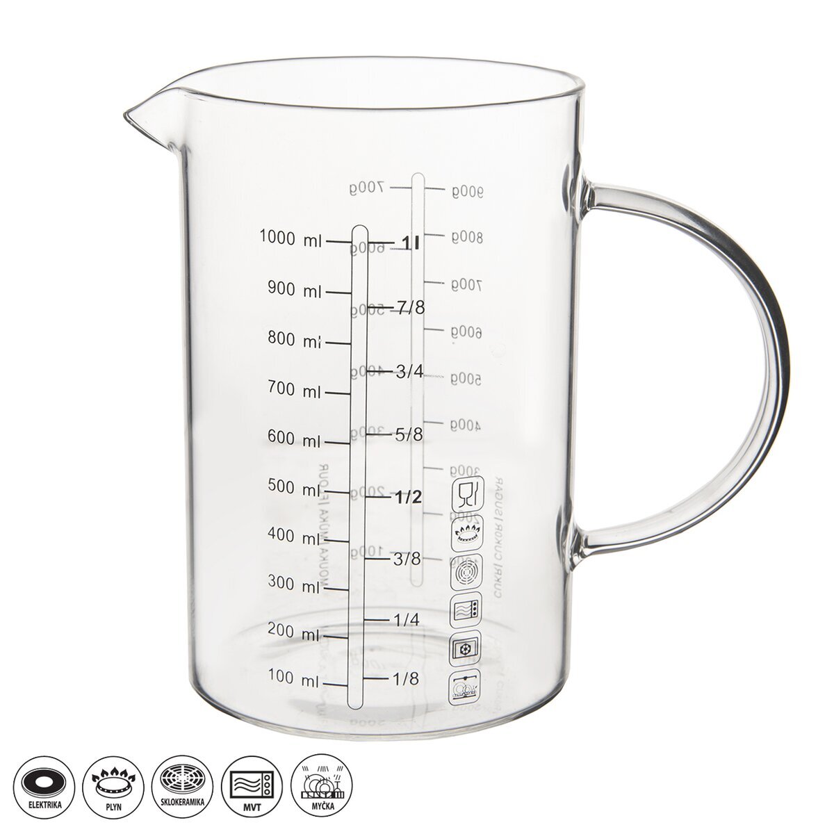 Odměrka s uchem a potiskem, který vám pomůže naměřit správné množství tekutin v ml a l, cukru a mouky v g. Materiál: borosilikátové sklo - vhodná pro přímý ohřev na mírném stupni zdroje tepla. Je možné tedy vařit i ohřívat v této odměrce, snáší teplotu od -40 °C do +300 °C. Rozměry: objem 1 l, celkový objem 1,2 l, pr. 10,5 cm, v. 16,4 cm. Lze ji použít v MVT, chladničce i mrazničce, lze ji mýt v myčce na nádobí.