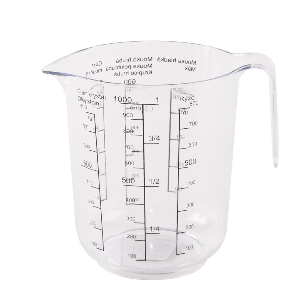 Odměrka s uchem a potiskem, který vám pomůže naměřit správné množství tekutin v ml, cukru, mouky... Materiál: kvalitní plast. Lze ji použít v chladničce, lze ji mýt v myčce na nádobí - ale nedoporučujeme, pokud chcete zachovat její čirost. Rozměry: objem 1 l, pr. 11,5 cm, v. 14 cm.