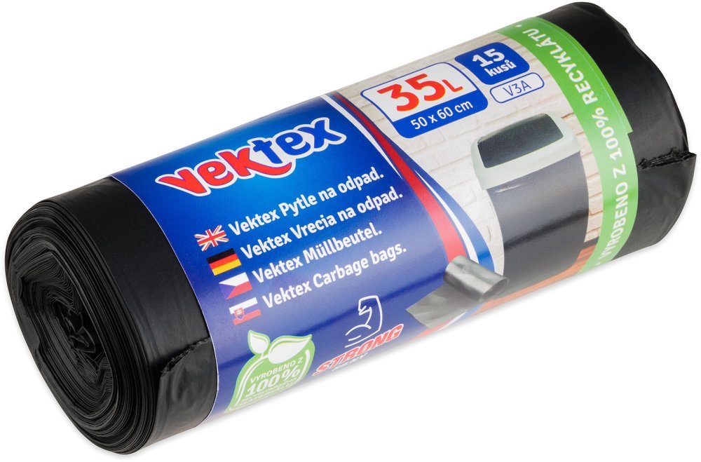 Vektex V3A 15 kusů extra pevných pytlů na odpad o objemu 35 litrů, barva černá, síla 22 mikronů, rozměry: šířka 50 cm, výška 60 cm.