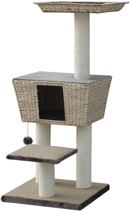 Přírodní škrábací strom z vodního hyacintu. Rozměr základny 48 x 48 x 4 cm Výška 114 cm Sisalové kmeny ø 9 cm Domeček 48 x 38 (40 x 30) x 25 cm Horní odpočívadlo 43 x 43 (35 x 35) x 5 cm Z různých možností k úkrytu a odpočinku si kočka může vybrat, kde se jí právě nejvíce líbí. Domeček z vodního hyacintu slouží jako úkryt a k nerušenému spánku. Velká polstrovaná výhledová podesta s okrajem z vodního hyacintu nabízí další místo ke spaní.