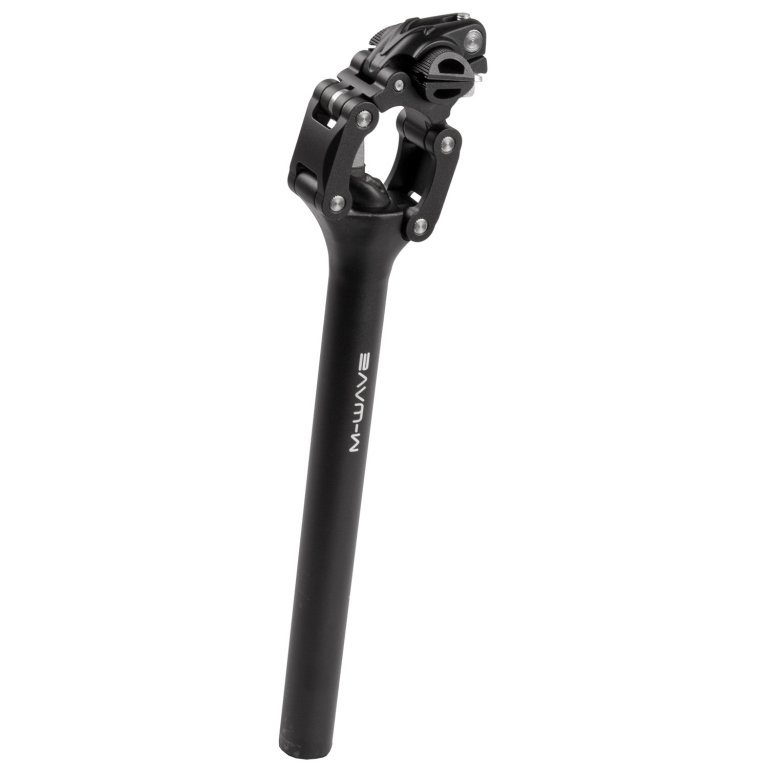 Odpružená sedlovka M-Wave s dvoubodovým uchycením na vzpěrách Průměr: 31,6 mm Délka: 350 mm Materiál: Al Nosnost: 50 - 90 kg Barva: černá Rozsah: 20 mm Vyznačená stupnice na sedlovce Balení: originální karta M-Wave Určeno pro odborný servis