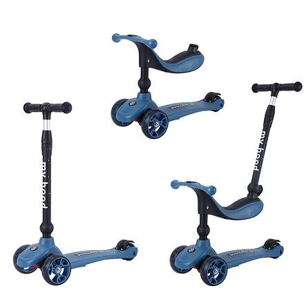 My Hood Kick\'n\'Ride - modréMultifunkční odrážedlo pomáhá rozvíjet rovnováhu a motorické dovednosti u dětí již od 1 roku věku. Toto odrážedlo nabízí 2 funkce, které mohou být přizpůsobeny vývoji dítěte. První funkcí je odrážedlo, na kterém se dítě může pohybovat šlapáním nohama. Díky tomu se rozvíjí rovnováha a koordinace. Pokud se dítě cítí unavené nebo se mu nechce na odrážedle jezdit, může ho někdo pomocí tyče v zadní části odrážedla tlačit. Druhou funkcí je koloběžka, kterou lze snadno přeměnit, jakmile jsou rovnováha a motorické dovednosti dítěte dostatečně rozvinuté. Díky dvěma velkým kolečkům vpředu a jednomu menšímu kolečku vzadu je koloběžka velmi stabilní a snadno ovladatelná.Parametry odrážedla Kick\'n\'Ride:nášlapná deska: 100% PP plastmateriál: nylon vyztužený skleněnými vláknyhliníková řídítka: nastavitelná (78,5-94 cm)materiál řidítek: TPR gumakola: 120x40 mm PU vpředu a 80x24 mm PU vzadubrzda: na zadním kolemaximální zatížení: 20 kg na sedadle a 50 kg na stupačkáchrozměry: 59 x 27 x 78,5-94 cmhmotnost: 4,6 kgdoporučený věk: 1-5