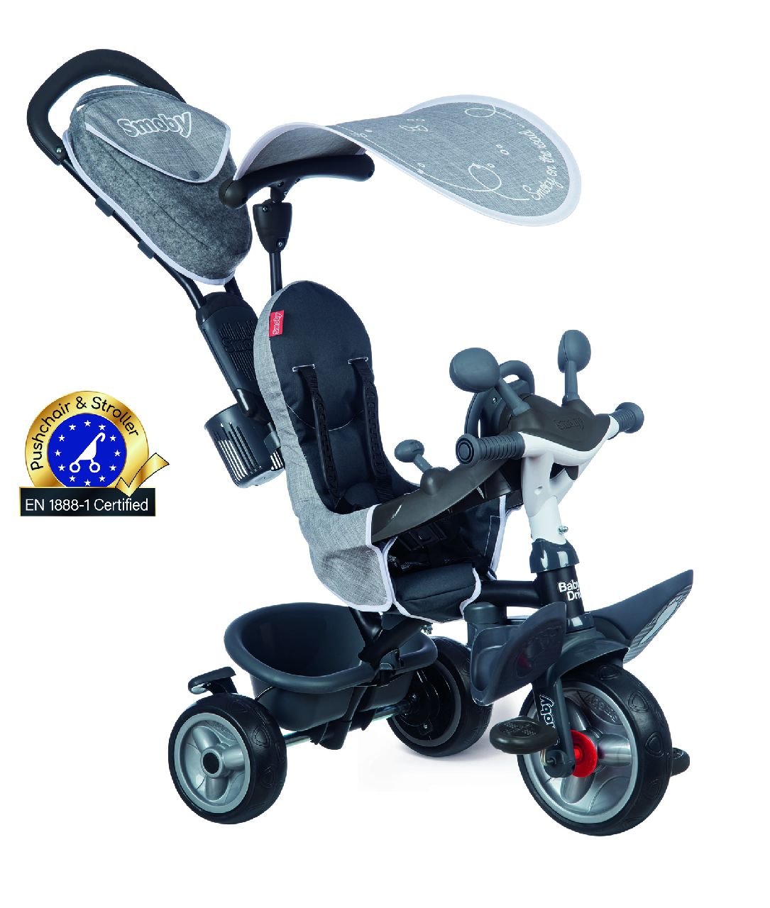 Multifunkční šlapací tříkolka s kovovým rámem, se stříškou proti sluníčku s UV ochranou v šedivém provedení vhodná pro chlapečky i holčičky. Intuitivní řízení pomocí nastavitelné a odnímatelné rodičovské vodící tyče. Nastavitelné sedadlo ve 3 směrech s opěrkou hlavy, s omyvatelným textilním potahem, odnímatelný bezpečnostní ochranný rám a pásy, volant s klaksonem a zpětnými zrcátky, sklopné odnímatelné stupačky na nožičky. Tichá, bezúdržbová a protiskluzová komfortní kolečka Whisper. Možnost zablokování šlapadel, parkovací brzda, výklopný plastový košík. Praktická taška a držák na láhev na vodící tyči. Certifikováno EN 1888-1 pro kočárky. Rozměry: 68 x 101 x 52 cm. Hmotnost 6,3 kg.