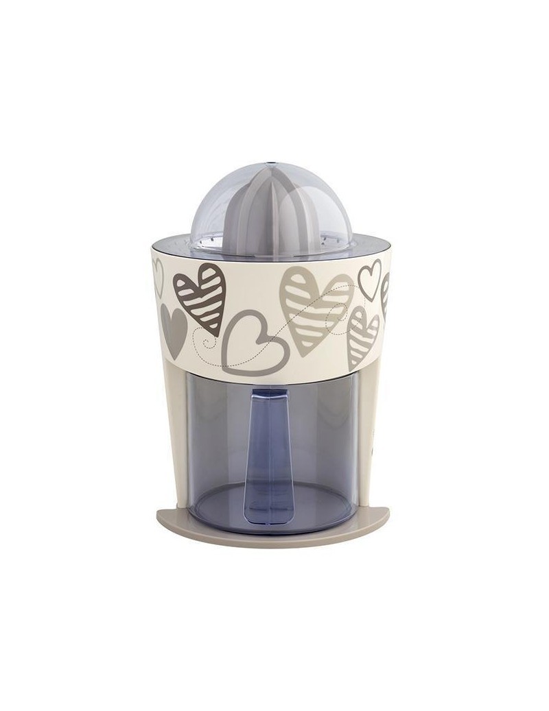 Elektrický odšťavňovač v krémové barvě s šedými srdíčkami.