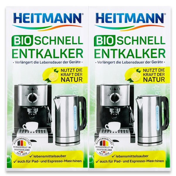 Heitmann BIO - Rychlo-odvápňovač vodního kamene z elektrických spotřebičů - 2x25gPotřebujete odvápnit kávovar? Pokud ano, tak je právě tento produkt vhodnou volbou, jelikož je na bázi přírodních kyselin, které účinně odvápní Váš kávovar, rychlovarnou konvici nebo jiný přístroj, který je potřeba pravidelně odvápňovat a navíc po sobě nezanechává chemickou stopu. Vše je na přírodní bázi, takže se nemusíte obávat toho, že Vám po odvápňění kávovaru nebude chutnat Vaše oblíbená káva!Balení v šáčku 2x25gDbejte bezpečnostního upozornění na obale.Použití a postup při odvápnění Vašeho elektrického zařízení: Při odvápnění zařízení vždy postupujte dle návodu výrobce Vašeho zařízení. Přípravek Heitmann Bio odváňovač je univerzální a je vhodný pro většinu přístrojů. V případě, že si nejste jisti vhodností, obraťte se na technickou linku výrobce Vašeho zařízení.