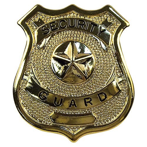 Kovový zlatý odznak s nápisem SECURITY GUARD. číst celé