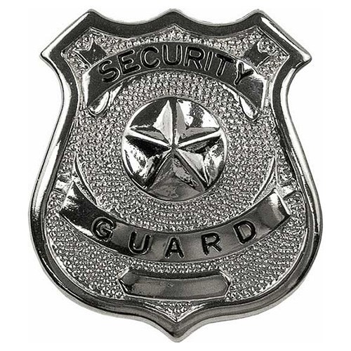 Kovový stříbrný odznak s nápisem SECURITY GUARD. číst celé