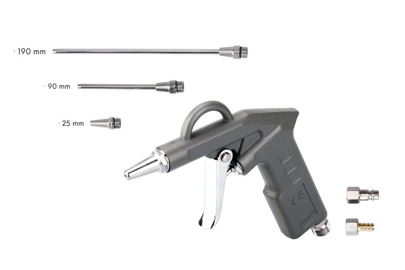 Tato ofukovací pistole je vybavena nástavci o šířce 25, 90 a 190 mm, které umožňují přesné a efektivní ofukování různých ploch a prostor. Pracovní tlak dosahuje až 10 barů, což zajistí silný a cílený proud vzduchu. Spotřeba vzduchu se pohybuje podle tlaku od 110 do 300 litrů za minutu. Pistole je snadno připojitelná pomocí rychlospojky nebo náústku s průměrem 8,5 mm na hadici, což usnadňuje manipulaci a zvyšuje komfort používání.