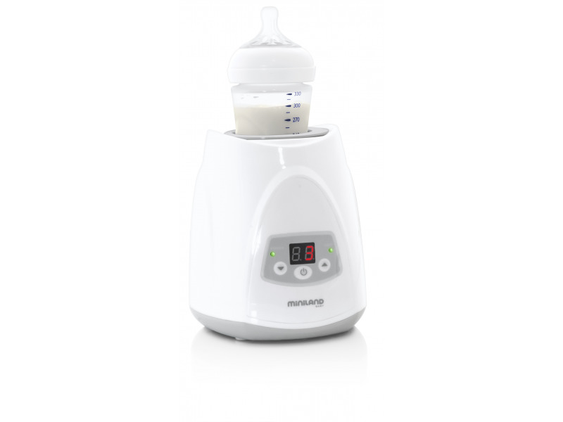 Ohřívačka kojeneckých lahví Miniland Warmy Digi velmi rychle ohřeje na optimální teplotu kojeneckou lahvičku s mlékem či skleničku s příkrmem. Ohřívačka mléko či příkrm jemně a šetrně ohřívá pomocí páry, takže veškeré nutriční hodnoty mléka i příkrmu zůstanou zachovány. Ohřívačka umožňuje nastavit vámi požadovanou dobu ohřevu a poté sledovat čas, zbývající do konce ohřevu. Upravením doby ohřevu můžete dosáhnout vyšší či nižší výsledné teploty nápoje či příkrmu, dle preferencí vašeho dítěte. Přístroj se velmi snadno ovládá s pomocí tří tlačítek, kterými ohřívačku zapnete, vypnete a nastavíte dobu ohřevu. Vizuální a zvukový signál vás upozorní na skončení ohřívacího cyklu. Ohřívačka se automaticky vypne, pokud v ní dojde voda. Kromě základny ohřívačky mohou být všechny části umývány v myčce na nádobí.