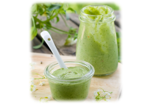 Bazalku důkladně omyjeme a rozmixujeme spolu s parmazánem, česnekovým práškem, konopným a olivovým olejem. Poté podle chuti osolíme, opepříme a přidáme citrónovou šťávu. Podáváme k masu, zeleninovým chipsům nebo k nachos.