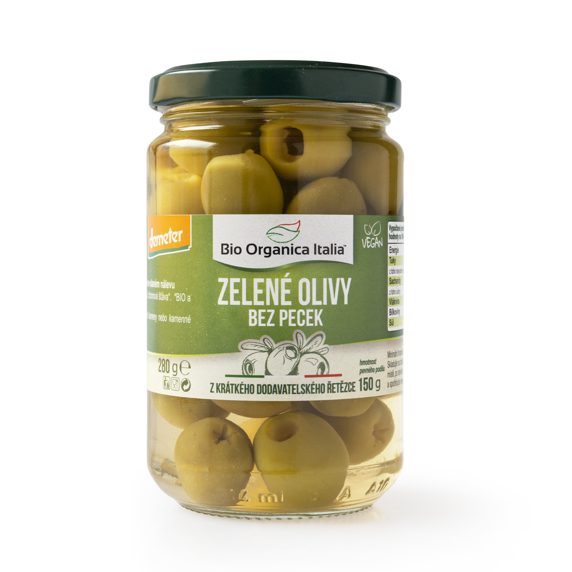 Zelené olivy*, voda, sůl, citronová šťáva.produkt kontrolovaného ekologického zemědělství a Demeter. *produkt kontrolovaného ekologického zemědělstvíIdeální jako aperitiv, předkrm nebo jako koření do salátů, pizzy, bruschetty, prvního nebo druhého jídla na bázi masa nebo ryb.