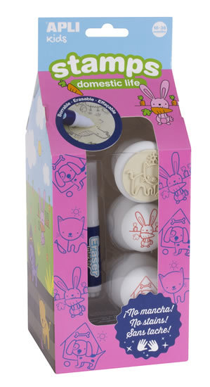 Razítka Domácí zvířátka - 3 ultralehká razítka se zmizíkem, poduška: modrý inkoust