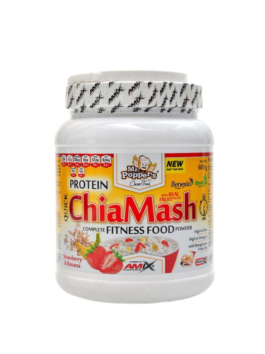 Mr. Popper´s® Protein ChiaMash® Se sladidly a s příchutí Příchutě: Ananas-kokos, Čokoláda, Jahoda-banán, Jablko-skořice-rozinky, Borůvka-jogurt, Oříšková. Čisté množství: 600 g. Mr. Popper´s® Protein ChiaMash® je výborně rozpustná směs na přípravu kaše se skutečnými kousky ovoce /oříšků nebo čokolády/. Obsahuje kvalitní směs bílkovin, značkové suroviny BevGrad™ XtraSmooth Flax, ovesné vločky v kombinaci s vybranými značkovými chia semínky Benexia®, které jsou zdrojem omega-3 mastných kyselin, bílkovin, antioxidantů, minerálů, vitamínů a rozpustné vlákniny. Mr. Popper´s® Protein ChiaMash® díky vysokému obsahu bílkovin napomáhá k růstu a udržení svalové hmoty, dále má vysoký obsah vlákniny. Proteinová Chia kaše je vhodná jako rychlá snídaně, ale můžete si ji připravit a konzumovat kdykoliv během celého dne. ALA a LA jsou esenciální mastné kyseliny, které jsou potřebné pro normální růst a vývoj dětí, dále přispívají k udržení normální hladiny cholesterolu v krvi. Příznivého účinku lze dosáhnout při denním příjmu 2 g kyseliny alfa-linolenové (ALA) a 10 g kyseliny linolové (LA). Ovesné beta-glukany snižují hladinu cholesterolu v krvi. Vysoká hladina cholesterolu je rizikovým faktorem pro rozvoj ischemické choroby srdeční. Příznivého účinku lze dosáhnout denním příjmem 3g ovesných beta-glukanů.