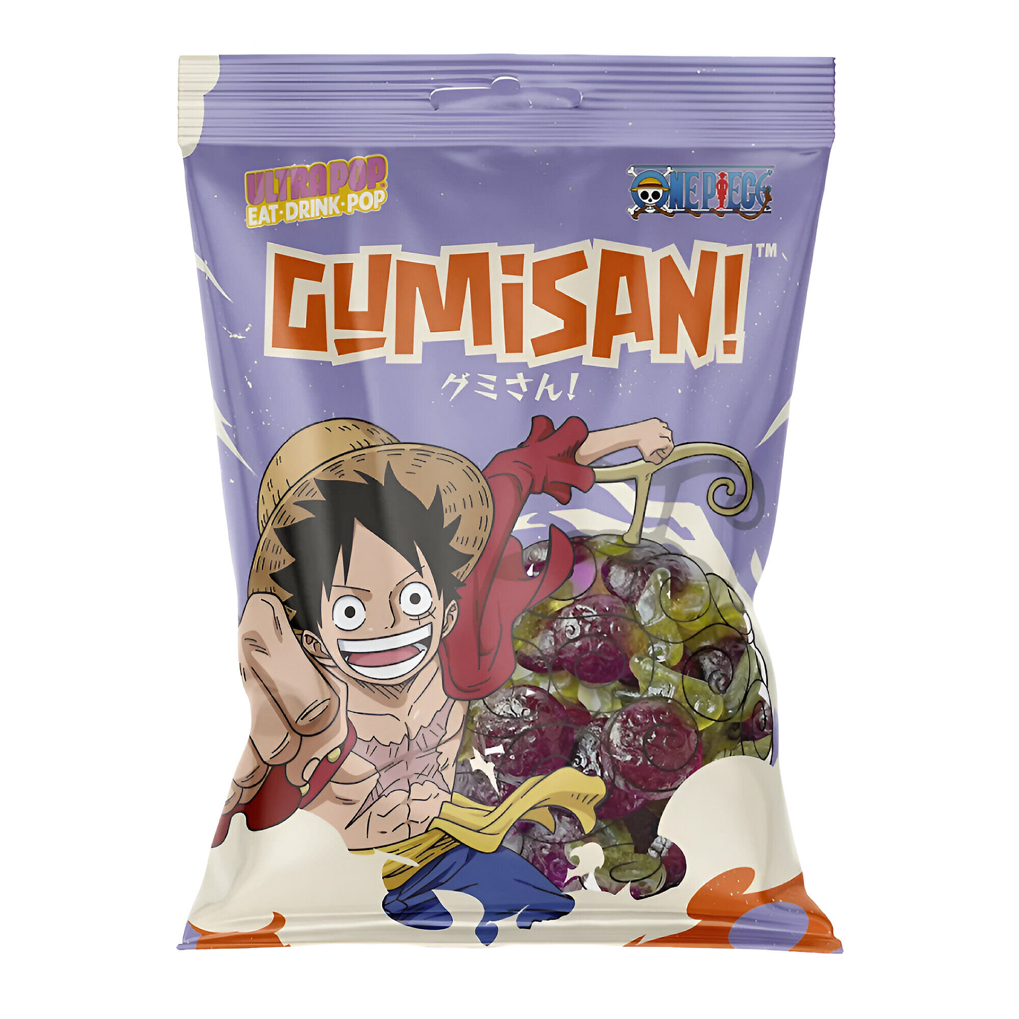 Pochutnej si na gumových bonbónech piráta Luffyho ve tvaru ďábelského ovoce z populární japonské mangy a anime One Piece! Poklad plný dobrot pro milovníky dobrodružství posádky Slamáků! Složení: glukózový sirup, cukr, hovězí želatina, voda, kyselina citronová (regulátor kyselosti), přírodní aroma: hroznové víno, batáty, jablko, ředkev, třešeň, extrakt z kurkumy, barvivo: brilantní modř FCF a rostlinný uhlík, karnaubský vosk (leštící látka).