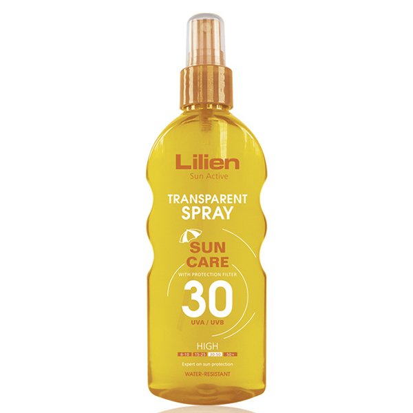 Lilien Sun Active transparentní sprej na opalování SPF 30 - VYSOKÁ OCHRANASpeciální voděodolný opalovací transparentní sprej s rozprašovačem je vyvinutý pro zákazníky, kteří nemají rádi použití opalovacích olejů a mlék. Transparentní sprej nezanechává mastný pocit na pokožce. Účinně chrání před slunečním zářením. Chrání pokožku před UVA/UVB zářením s vysokým ochranným faktorem SPF 30