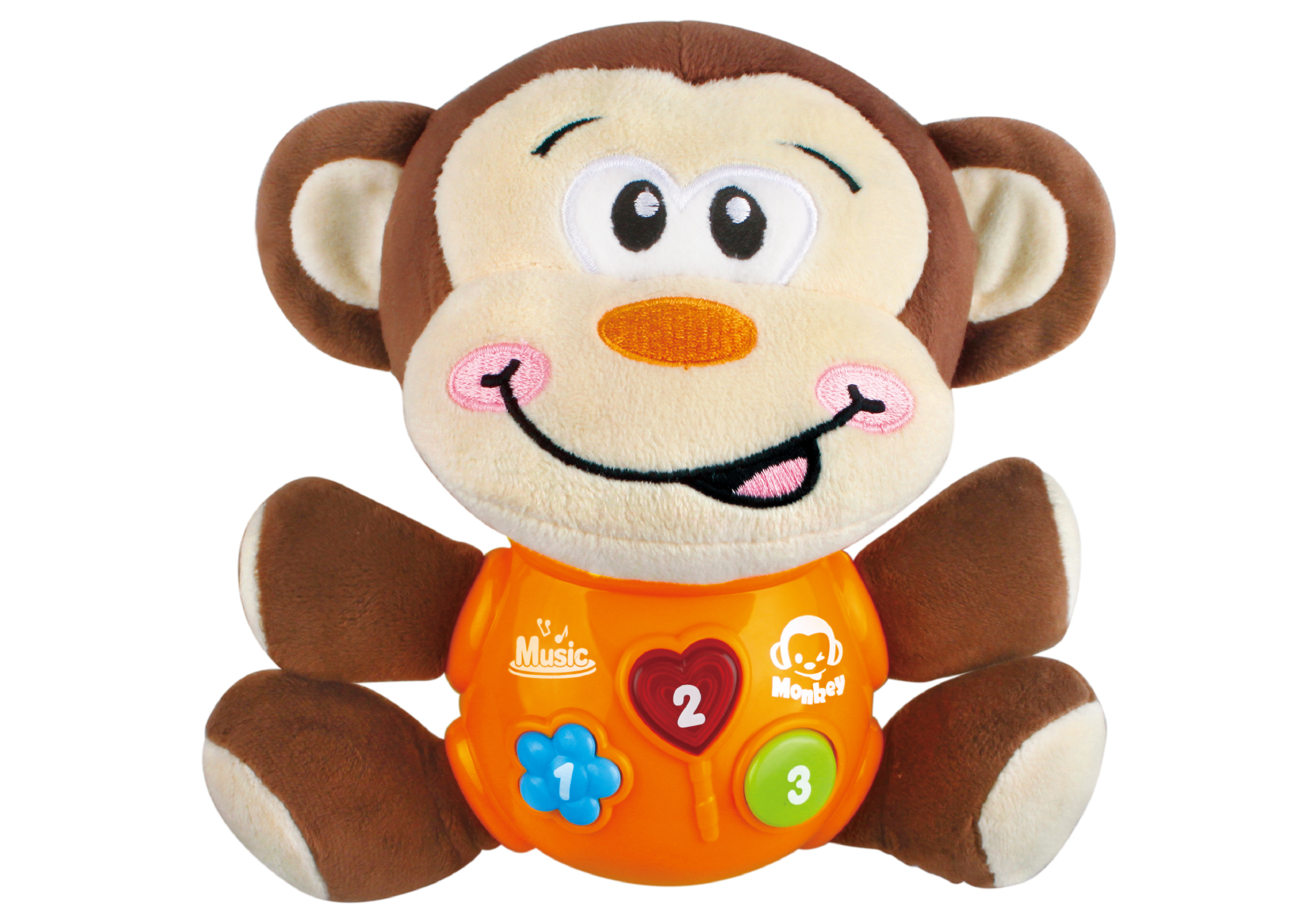Plyš opice s efekty. Velikost 16 cm. Vydává světelné a zvukové efekty (hudba). Aktivace tlačítky na bříšku (srdíčko - melodie, kulaté - zvukové efekty, květina - zvuky přírody). 2xAAA baterie (nejsou součástí).