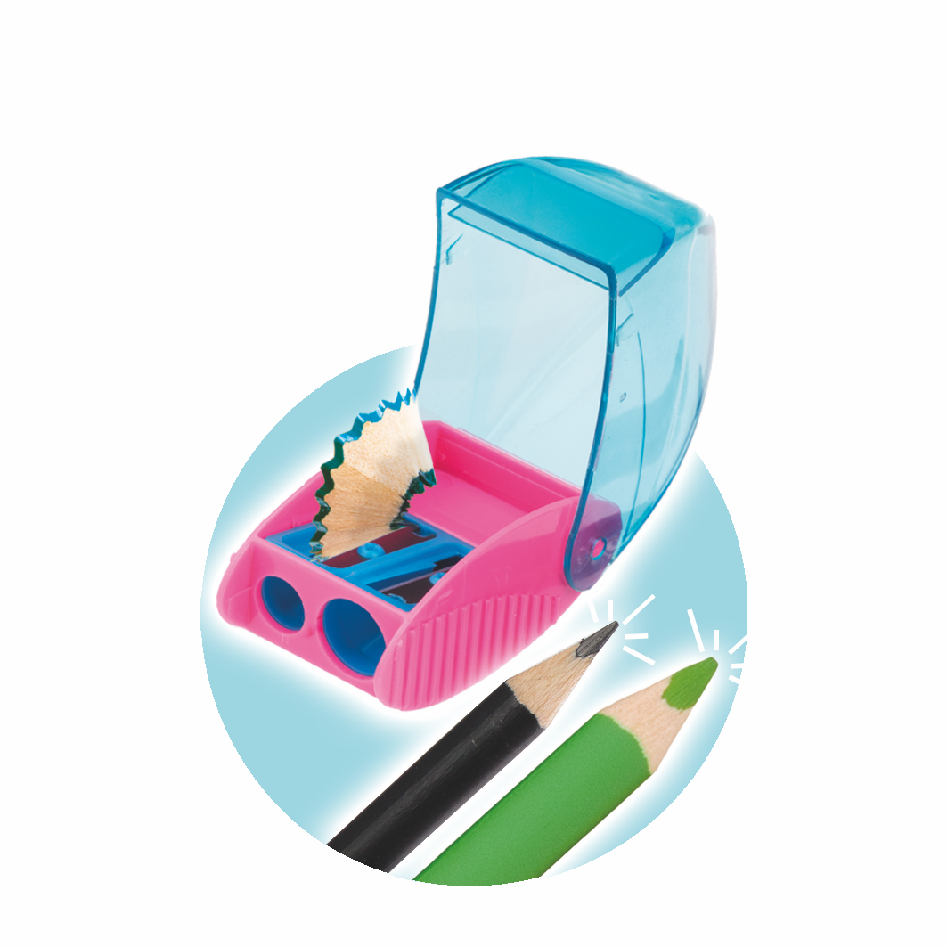 SNAPPY, dvojité plastové ořezávátko se zásobníkem, mix 5 barev (červená, žlutá, modrá, zelená, růžová)